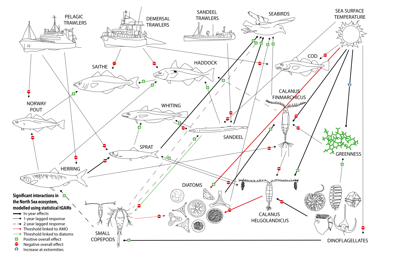 - The North Sea is one of the most anthropogenically impacted marine ecosystems (Halpern et al., 2015; Emeis et al., 2015). Small shoal fish in mid-level trophic levels experience top-down pressure from commercial fisheries whilst bottom-up processes driven by temperature, have dominated changes to planktonic groups since the 1960s. These pressures propagate up and down the food chain, with mid-trophic fish linking the pressures between the upper and lower trophic levels (Lynam et al., 2017).